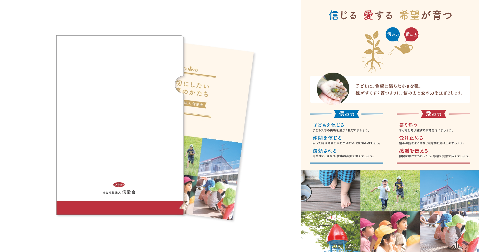 →園で大切にしている保育観をロゴやパンフレット、封筒などのデザインに反映させます。自園らしさをカタチにし、園内外からの共感や信頼感を高めます。